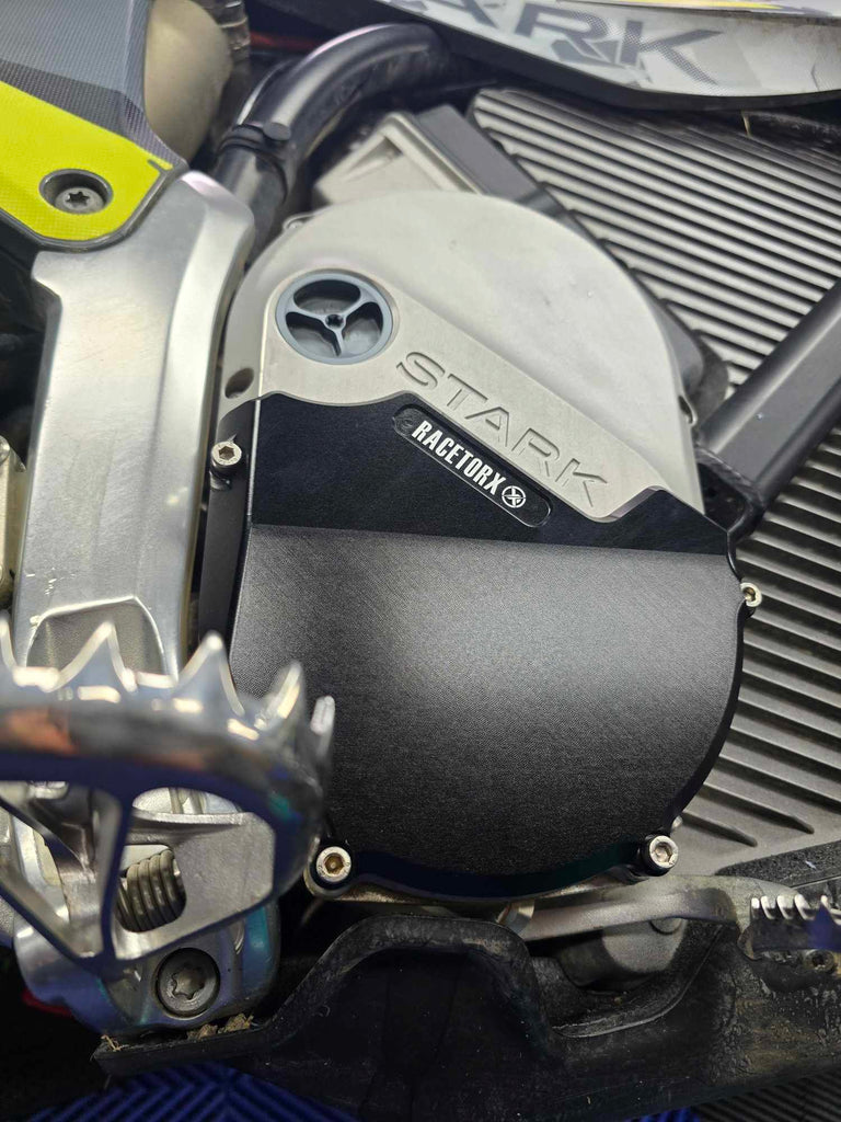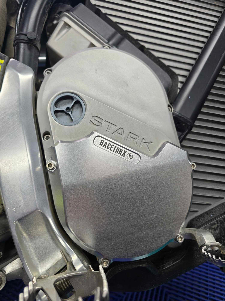 The motor cover uses the lower OEM mounting points to mount to, this allows the OEM cover to stay on the bike and the cover follows the contours of the stark case for the best fitment while following the angle of the stark logo.